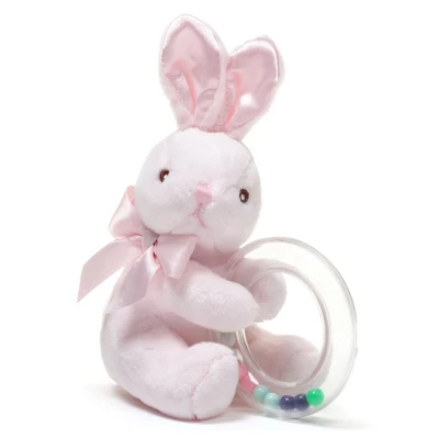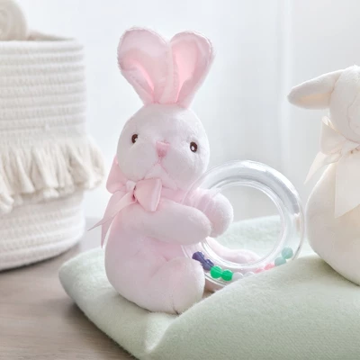 - CUTE AND FUN: Adorably cute pink bunny rattle toy with plastic ring rattle and colorful beads sits 5.5″ tall