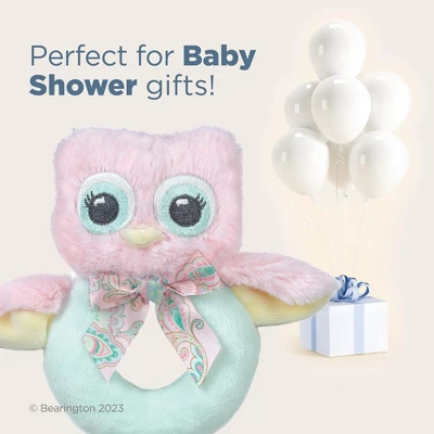 This soft plush Lil’ Hoots owl ring rattle provides comfort and play activity for babies. This baby rattle is sure to become baby’s favorite. Measuring 5.8″, this plush owl rattle is the perfect size for baby to hold. Made by the Bearington Baby known for their outstanding quality and fine fabrics. Gives you the assurance that this will be one that is treasured for years. Machine washable.