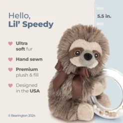 This soft plush sloth shaker rattle provides comfort and is a great play activity for newborns and babies. This baby rattle is sure to become your little one’s favorite. Measuring 5″, Bearington’s Speedy sloth shaker rattle is the perfect size for baby to hold. Made by the Bearington Baby known for their outstanding quality and fine fabrics. Gives you the assurance that this will be one that is treasured for years.