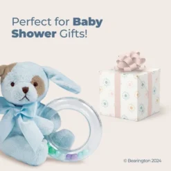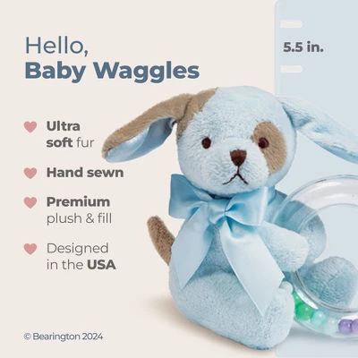 This soft plush Waggles Shaker blue puppy with ring rattle provides comfort and play activity for babies. This baby rattle is sure to become baby’s favorite. Measuring 5.5 Inches, this blue dog rattle is the perfect size for baby to hold. Made by the Bearington Baby Collection, known for their outstanding quality and fine fabrics. Gives you the assurance that this will be one that is treasured for years.