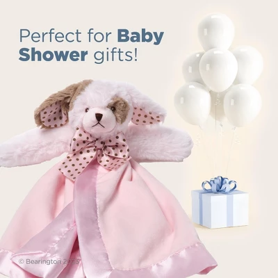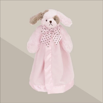 - PREMIUM MATERIALS: Blanky is made with luxuriously soft pink velour and is lined and trimmed in silky satin, the plush puppy dog features polka dot satin ears, adorable brown eye patch and ear, embroidered safety eyes and a satin polka dot bow