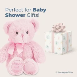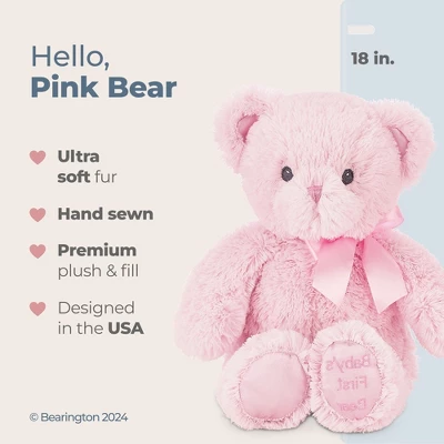 - Introducing Large Pink Bear: Discover the charm of the Large Pink Teddy Bear Plush. At 18 inches, this teddy bear stuffed animal is fluffy, cuddly, and incredibly adorable and reads “Baby’s First Bear” on its paw pad. Perfect for babies and kids, this standout among stuffed animals & teddy bears promises cuteness and companionship that lasts a lifetime.