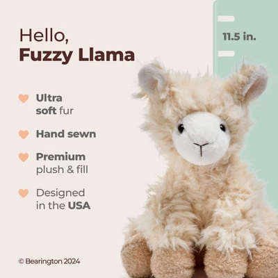 - FUZZY THE PLUSH LLAMA: Adorably cute 11.5″ tall llama stuffed animal with ultra soft off white fur, soft tan accents, cuddly body and sweet expressive face, surface washable