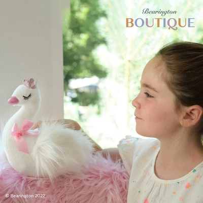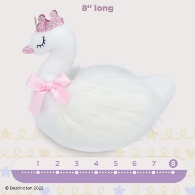 Meet Grace, a sparkly and sweet princess swan with charming details. This 8” plush swan is designed with soft white fur and posh feathers. She wears a glittering crown, rests in an adorable position, and has a sweetly slumbering face. Delight in keepsake gifts by Bearington, the world leader in creating handcrafted plush animals. Perfect for holidays, birthdays, graduation gifts and more.