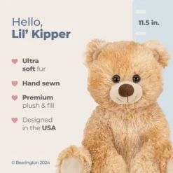 Meet Lil’ Kipper! This ultra-soft 11.5” light brown bear is the perfect combination — a vintage-style teddy bear made with modern materials. Delight in the Bearington collection heritage-quality classic and collectible teddy bears for holidays and special occasions. Great for collectors of all ages. Every Bearington is created with our commitment to delivering custom-designed, impeccably crafted stuffed animals