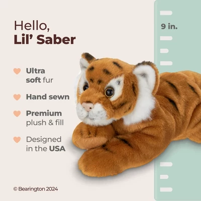 You will love the fine detail Bearington Collection uses to bring Lil’ Saber, the tiger, to life. Hand crafted using the most luxurious, soft plush and with hand airbrushed detail, this tiger stuffed animal is perfect for everyone from the collector to a special child in your life. Huggable and pose-able, Lil’ Saber will make the perfect companion. Lil’ Saber measures 9″ long from front foot to back foot when laying.
