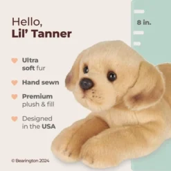 Introducing Bearington Collection’s Lil’ Tanner The Labrador Stuffed Puppy, a charming embodiment of quality and craftsmanship. This small stuffed dog, standing 8 inches tall, is designed to captivate with its fluffy, cuddly, and undeniably adorable appearance, perfect for babies and kids. Crafted from premium plush fabric, Lil’ Tanner features soft fur that captures the essence of a cuddly companion while promising skin-friendly comfort. The incorporated excellent craftsmanship is a testament to Bearington’s commitment to creating high-quality stuffed toys. Bearington, a renowned name in the industry, is celebrated globally for its plush toys that exude opulence in fabrics and unparalleled craftsmanship. Lil’ Tanner falls beautifully in line with this ethos, presenting a uniquely designed labrador stuffed animal that breathes life into playtimes. As part of Bearington’s legacy of 25 years, Lil’ Tanner is an addition to an collection spanning timeless teddy bears to lifelike labrador retriever stuffed animals. For all ages, Bearington’s creations are more than just playthings; they are companions that instill a sense of joy and comfort.