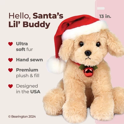 Introducing Santa’s Lil’ Buddy! This charming musical Christmas plush dog, part of the award-winning Bearington Collection, is the epitome of exquisite craftsmanship. With care given to slightest details, each crease and curve of this lovable puppy is brought to life, creating a uniquely engaging, almost life-like appearance. This Christmas stuffed dog exemplifies both matchless originality and a timeless appeal that’s etched in every Bearington creation since its inception in 1997. Masterfully handmade, the luxury of the supremely soft plush used in crafting Santa’s Lil’ Buddy is instantly captivating and offers unrivaled huggability. This isn’t just another animated Christmas animal; it’s a carefully developed work of art, perfected to be an irresistible companion for a special child or a prized gem for a discerning collector. The dog’s ability to strike the most adorable poses adds an extra layer of realism, transforming Santa’s Lil’ Buddy into more than just a stuffed Christmas dog, but rather a storyline ready to unfold in your home. This Christmas puppy stuffed animal embodies the holiday spirit, serving as a delightful accessory to complement your Christmas decor or festive attire. His joyous tune will fill the room with a magical yuletide ambience, making Christmas extra memorable for everyone. Bearington’s exceptional designs have earned the prestigious recognition of more than 100 industry accolades, such as the Canadian Collectible of the Year Award, multiple nominations for NALED Plush of the Year, CIB Collector’s Choice Awards, TOBY Industry Choice Awards, and a host of Golden Teddy Awards. Standing 13″ tall and suitable for ages 3 and up, Santa’s Lil’ Buddy, a musical Christmas dog, is a testament to Bearington’s commitment to quality.
