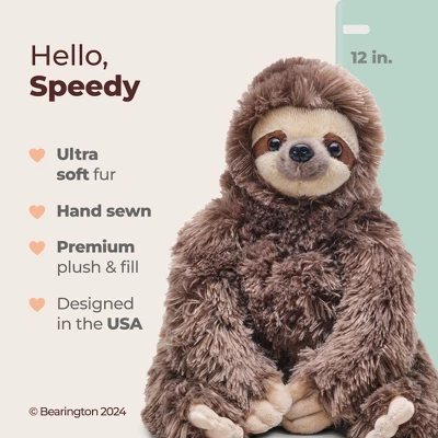 Meet Speedy. He may not actually be fast, but he is definitely soft and cozy. This adorable 12” tall plush 3-toed sloth makes a great snuggle buddy for any child or adult. Everybody deserves more snuggles! Delight in keepsake gifts by Bearington, the world leader in creating handcrafted plush animals. Perfect for holidays, birthdays, graduation gifts and more.