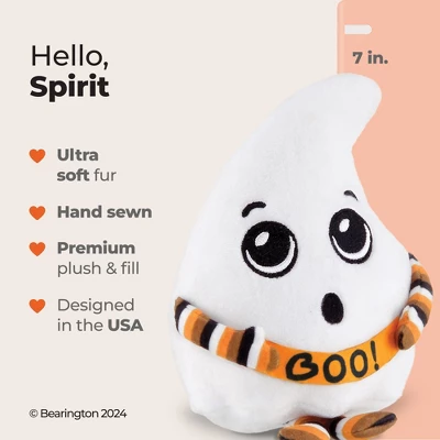 - MEET SPIRIT THE GHOST: Introducing Spirit the Ghost, an adorable 7-inch tall Halloween plush! This soft, machine washable white ghost features charming striped arms and a “Boo!” banner.